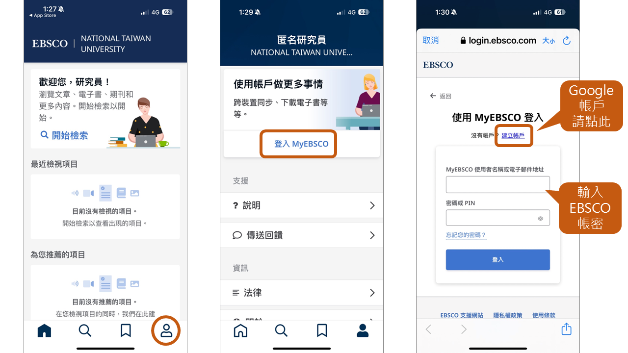 點選APP右下角人頭,即可從登入MyEBSCO。