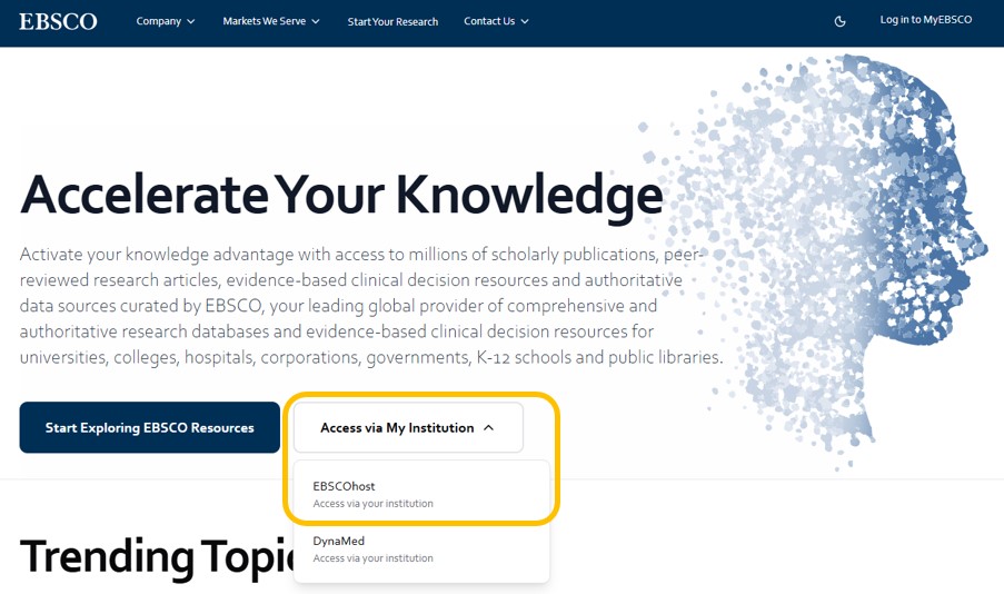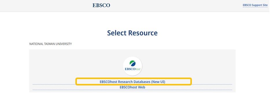 點選「Access Via My Institution」→「EBSCOhost」,再點選「EBSCOhost Research Databases (New UI) 」。
