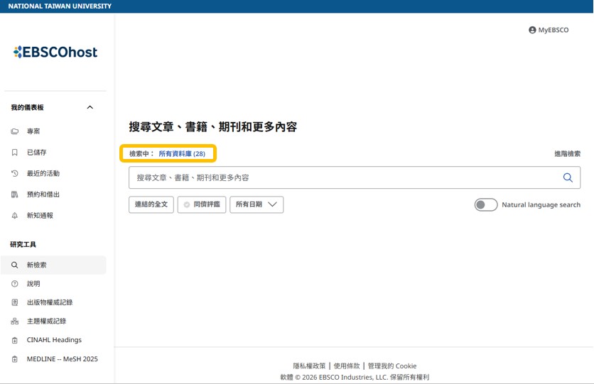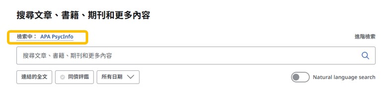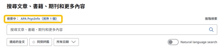 完成後進入資料庫查詢頁面。上方會顯示您目前查詢的資料庫,可再次點擊藍字以加選其他資料庫,確認選取后將以省略的方式顯示您目前查詢的多個資料庫。: