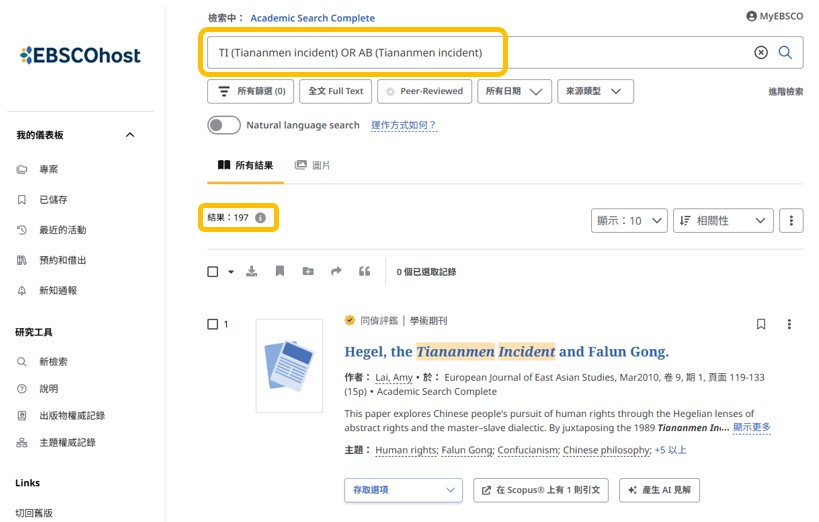 在 Academic Search Complete [EBSCOhost] 資料庫以「Tiananmen incident」一詞在Title、Abstract欄位搜尋,能找到160幾篇文章;用「TIANANMEN Square Incident, 1989」搜尋Subject term則能找到470多篇文章。例如:1989年刊載於《World Affairs》的<Chronology of events related to the 1989 Tiananmen Square Incident>一文,依照天安門事件爆發的時間,逐日記載當日發生的情形,可作為歷史研究的佐證。