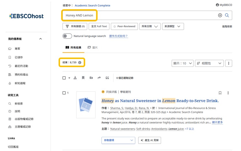 進入圖書館整合查詢系統 SLIM 的「進階檢索」功能,查詢範圍選擇「全部」,輸入honey、lemon 兩個關鍵字,可搜尋到1萬5千多筆檢索結果呢!