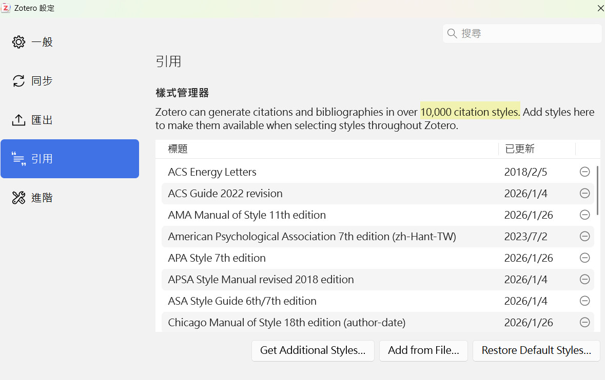 4. 在Word、Google Doc及LibreOffice中引用及產生參考書目 : 透過安裝編輯軟體的外掛程式,就可在撰寫文章時同步引用文獻並產生參考書目,Zotero預設提供APA、MLA、Chicago、Vancouver等常見引文格式,目前透過Citation Style Language計畫,Zotero 8.03版本提供超過10,000種引文格式供下載。