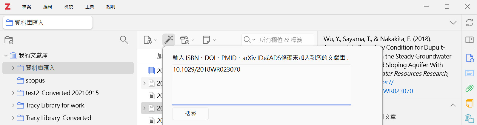 在文獻庫中可使用 ISBN, Digital Object Identifier (DOI) 或 PubMed ID (PMID) 查詢,並直接匯入書目資訊至目前選取的文獻庫。