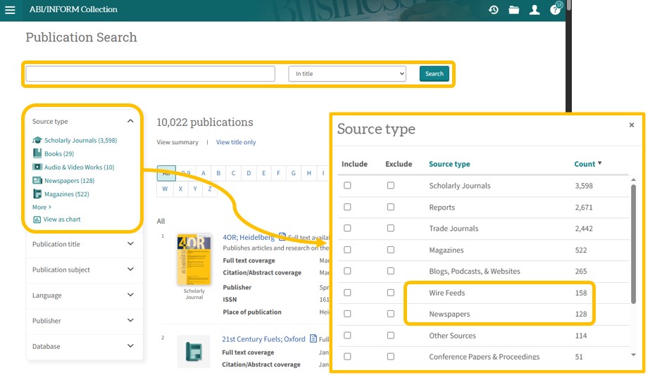 進入 ABI/INFORM Collection 資料庫後,由上方的「出版物」,輸入報紙名稱或地名搜尋,「來源類型」篩選為「電報新聞」,即可瀏覽報紙,但需留意各報刊的收錄年代範圍。