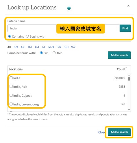 至於「進階檢索」功能,先於下方的「來源類型」欄位勾選「報紙」、「電報新聞」,至於「地點」欄位則建議點選「尋找地點」來查詢地名,以印度為例,於「尋找地點」的小視窗輸入India,點選「尋找」,選取相關的地名詞彙「新增至檢索」。設定好上述兩個檢索條件後,即可點選「檢索」,若有需要可另外於上方設定日期、輸入關鍵字搜尋篇名等。