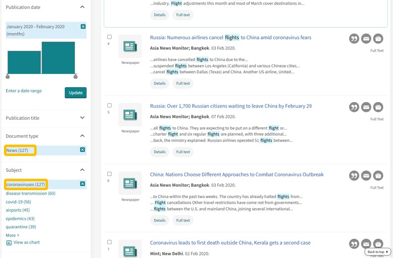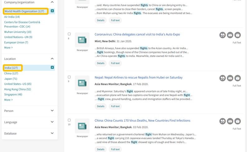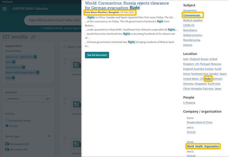 (6) 主題:本資料庫偏重於商業管理領域,在商業、投資、經濟、科技/專利/產業發展方面的內容較多,分類也較精細。我們搜尋2020年包含 flight的新聞報導,主題除了航空、飛機、機場以外,還有新型冠狀病毒,查得印度政府想派班機飛往中國撤僑的新聞。