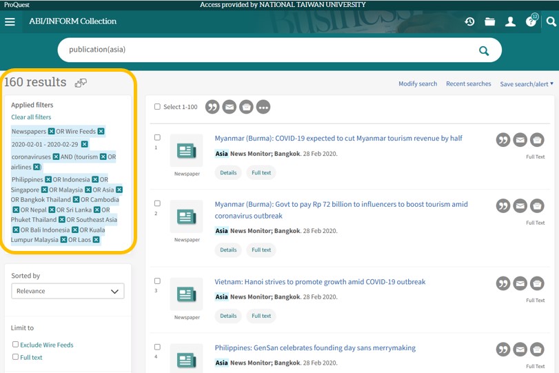 示範另一個查詢例子,欄位選擇「來源出版物」,搜尋較廣泛的關鍵字: Asia。檢索結果左側的篩選條件再於「地點」勾選 Thailand, Vietnam, Singapre 等東南亞國家,便能查到《Asia News Monitor; Bankok》等報紙的新聞。