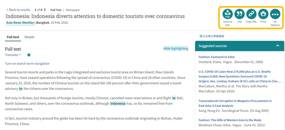 進入其中一篇標題為印尼觀光受新型冠狀病毒疫情影響的報導,全文是網頁純文字的方式,可使用右上角的工具自行儲存成PDF格式、email、列印等。