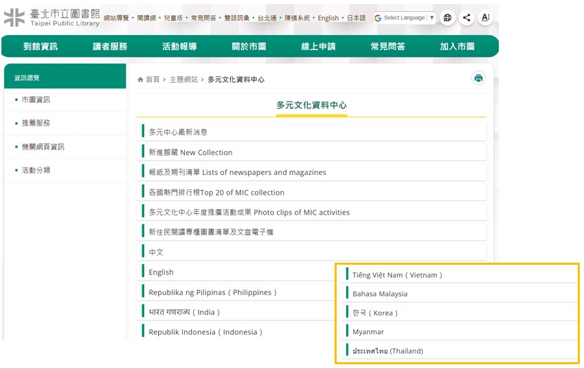 位於新北市中和區的「國立臺灣圖書館」為公共圖書館,新住民服務的「多元文化資源區」購置逾8000冊圖書期刊與視聽資料,包括 7種東南亞地區的報紙:Popular Journal (緬甸週報)、印尼星洲日報、中華日報 (泰國)、Thanh Niên (越南青年報)、Myanmar Times (緬甸時報)、Abante Tonite (菲律賓日報)、Utusan Malaysia (馬來西亞日報)。