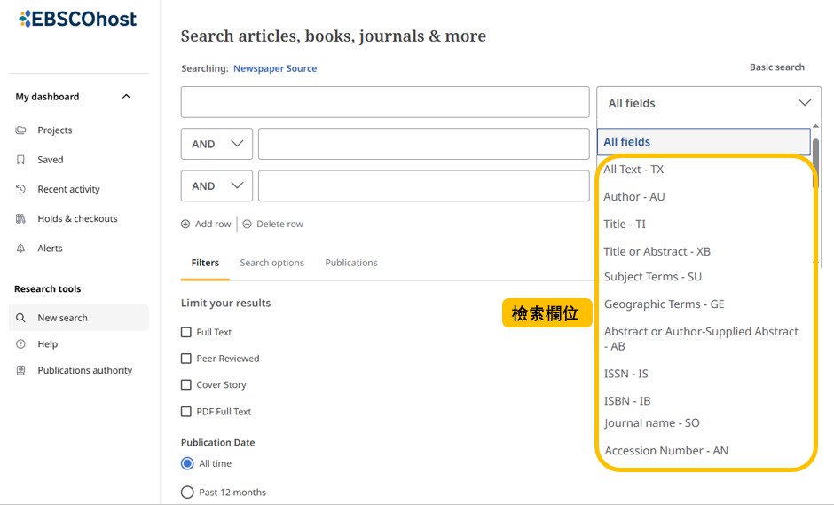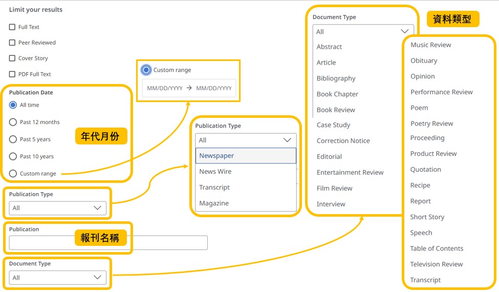在進階檢索方面,可在下方設定資料類型(如: 摘要、社論、評論)、報紙的年代月份、特定報刊名稱,或於上方的檢索欄位選擇篇名(Title)、地名(Geographic Terms)、報刊名稱(Journal name)後搜尋關鍵字。