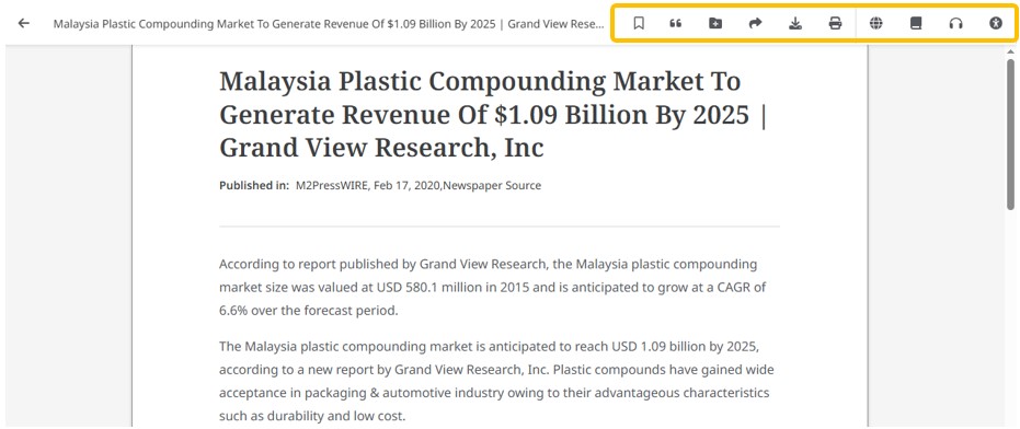 以搜尋Malaysia為例,可查得報導馬來西亞塑膠配混市場的新聞,全文為HTML網頁文字格式,無PDF檔案,可利用網頁右側的儲存、列印、匯出、語音、翻譯等工具。