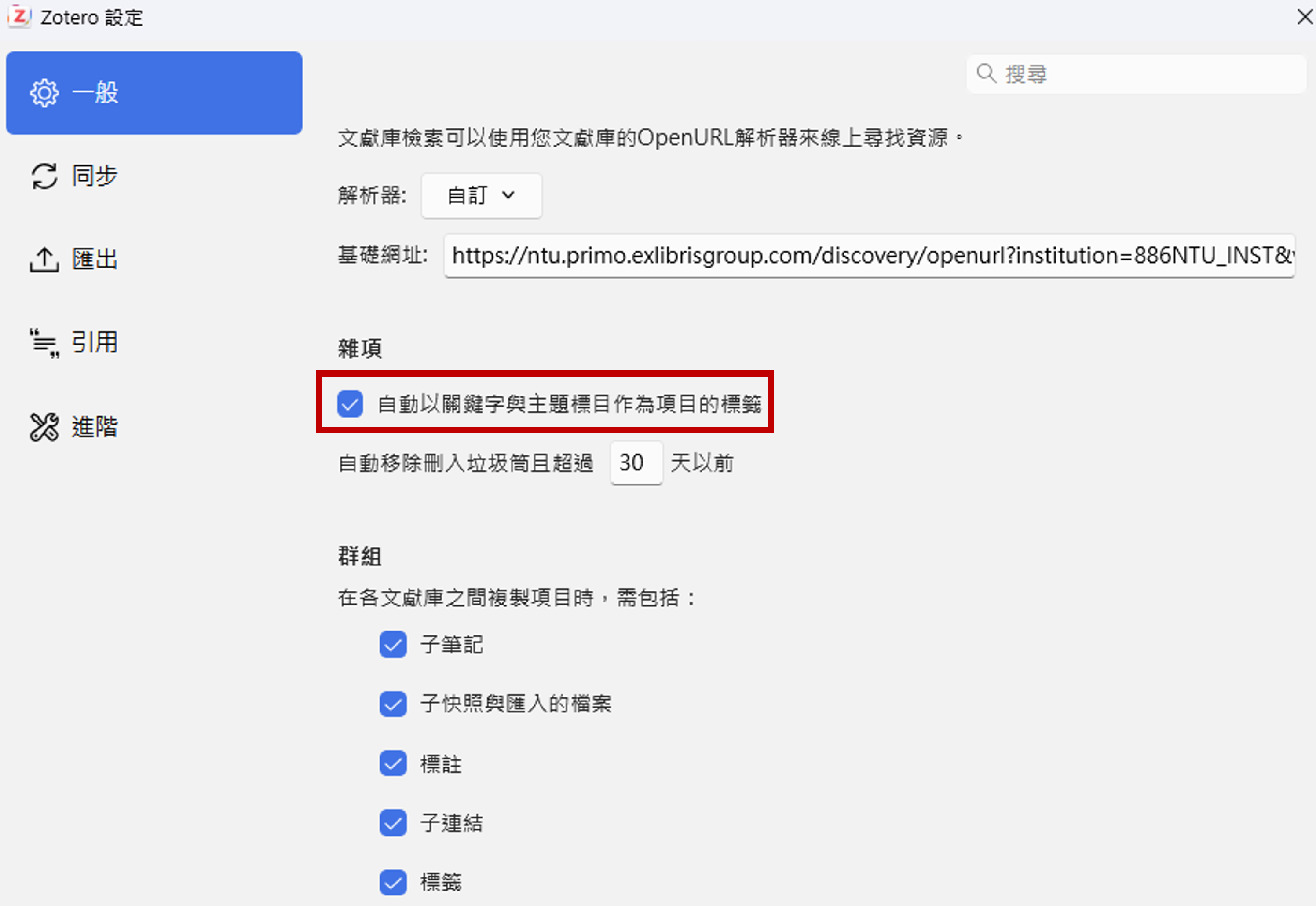 若覺得自動產生的標籤過多或不符合需求,也可以調整相關設定:在 Zotero 中可由「編輯 > 一般 > 雜項」中,勾選或取消「自動以關鍵字與主題標目作為項目的標籤」,以控制是否啟用自動標籤功能。
