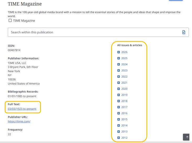 Click the second one “Time” on the search result page to check the details. All the three online sources are from EBSCOhost database. Users can use the Time magazines from 1923 to date online.