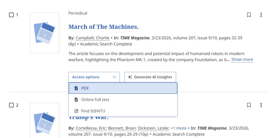 From the results, you will see several editions of Time magazine in NTU Library collection. Both print and electronic form are available.