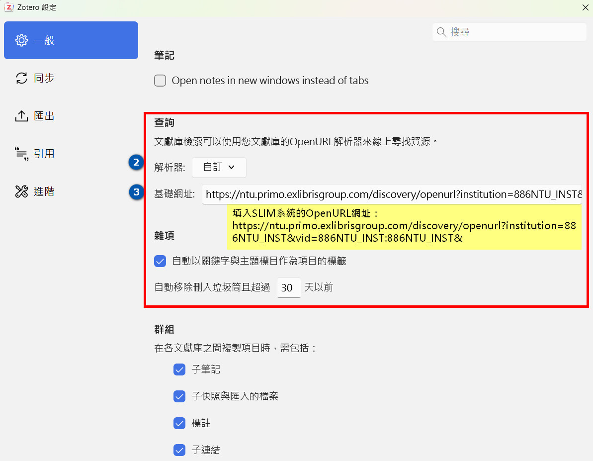 若想要從Zotero中查找臺大圖書館的館藏目錄系統,也是要利用OpenURL網址(請參考這篇文章「EndNote的Find Full Text無法取得全文怎麼辦?請善用Open URL Link!」所提到的網址)。只要依照下列步驟,調整偏好設定,就可連至臺大圖書館SLIM系統查詢館藏了!