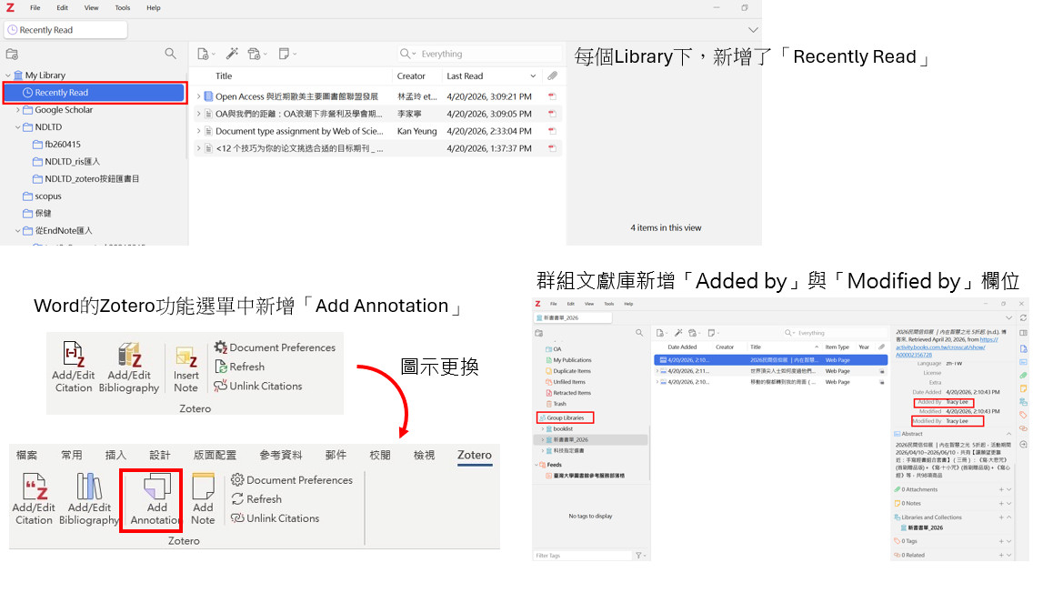 其他新增功能如: 在每個Library下新增了「Recently Read」、在文書編輯器如Word的Zotero功能選單中除了新增「Add Annotation」功能,也更換了整體圖示、群組文獻庫新增區分組群成員貢獻的「Added by」與「Modified by」欄位等, 其他更多Zotero 9新增功能,請參考Zotero部落格說明。